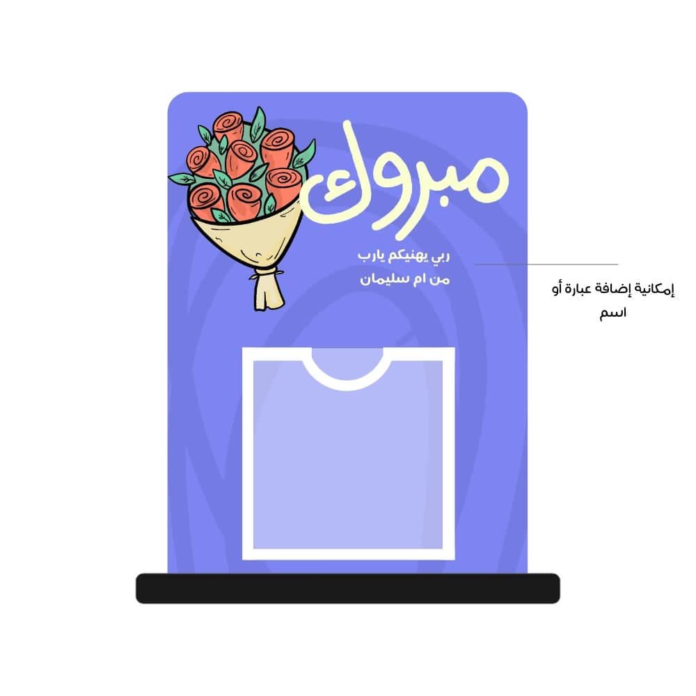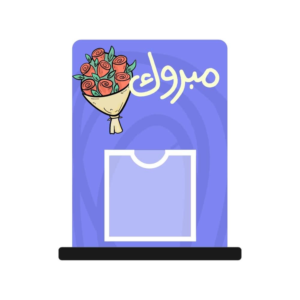 يتميز الستاند بعبارة "مبروك" بخط أنيق، تتوجها رسمة باقة ورد ملونة، مما يجعله